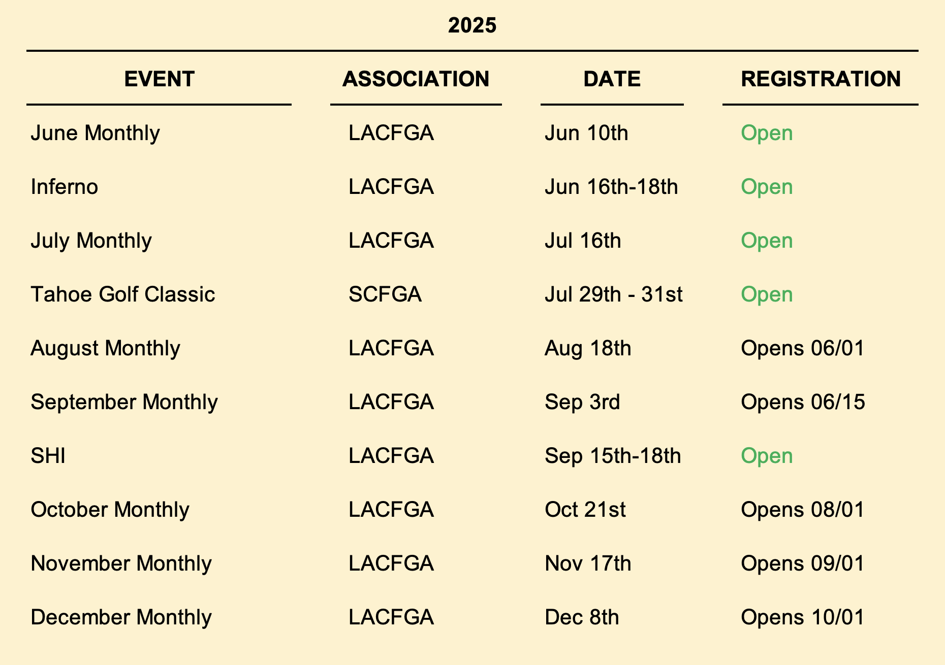- Wednesday - 6:00 pm Banquet @ Singing Hills Magnolia room. Prize money
