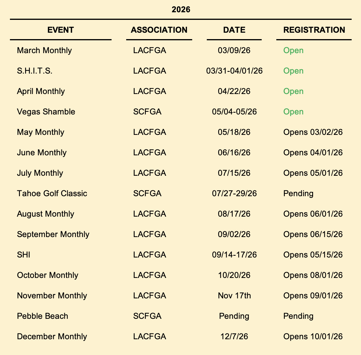 Monday March 9th, with a 9:00 shotgun start we head to California Country Club. The Open Players - Gold tees, will be playing at 6531 yards with a slope of 71.2/124 and the Senior Players - Whits tees, will be playing at 6098 yards with a slope of 69.1/119. C.C.C. does not have a driving range but there are some nets you can hit balls into to warm up, there also are practice putting greens. The snack shop will be open at the turn. The restaurant and bar will be open after the round with a limited menu.